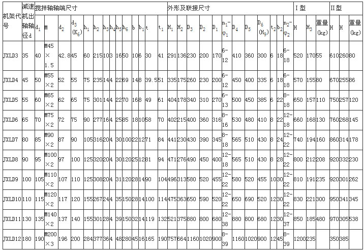 本機(jī)架系列的JXLD型適用于與XLD型擺線針輪行星減速機(jī)及CFL型行星齒輪減速機(jī)連接,JBLD型適用于與BLD型擺線減速機(jī)連接。為使攪拌軸與軸承室裝配、維修方便,本公司對(duì)軸承室結(jié)構(gòu)進(jìn)行改進(jìn)設(shè)計(jì),同時(shí)對(duì)與BLD2、BLD3、BLD4相配的機(jī)架JBLD2,JBLD3JBLD4的軸承室加大,使之與較粗的攪拌軸相一致。
